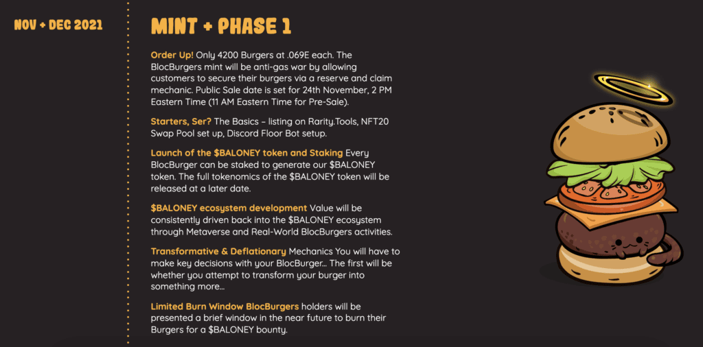預售和銷售詳情: 只有4,200 個NFT 漢堡將以0.69 ETH 開採。公開發售的日期定為美國東部時間11 月24 日下午2 點和預售時間上午11 點。 Bloc Burger 的最後一句話和比賽